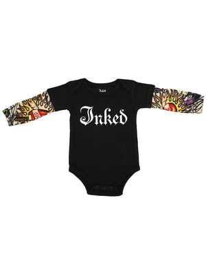Introduce your little one to the tattoo lifestyle with the Tattoo Sleeve Baby Onesie featuring a bold Choppers print. This black onesie combines comfort and style, showcasing tattoo-inspired artwork on mesh sleeves. Perfect for parents who want to share their love for ink with their newborn, this onesie is both playful and edgy.